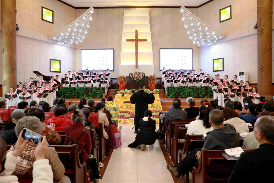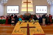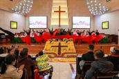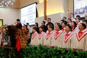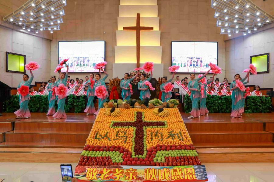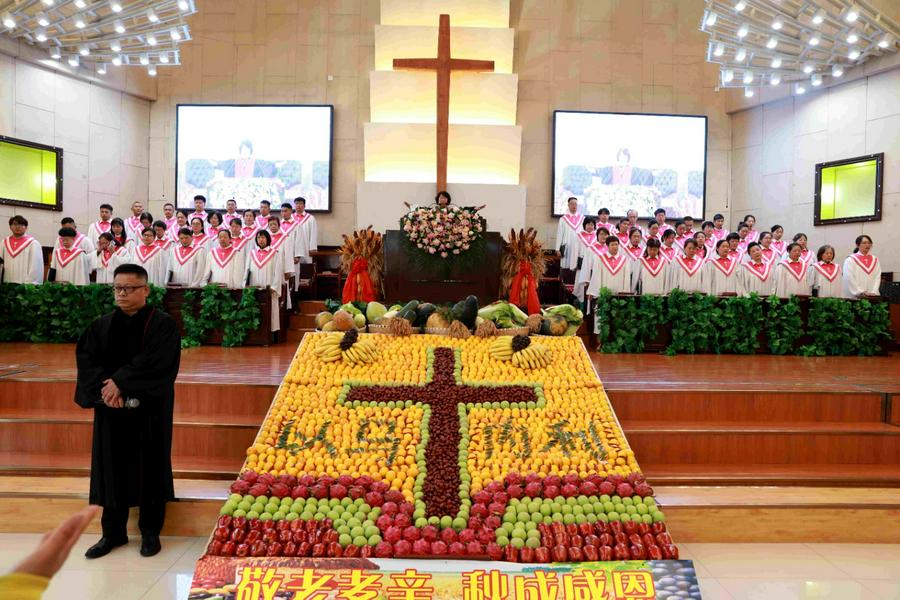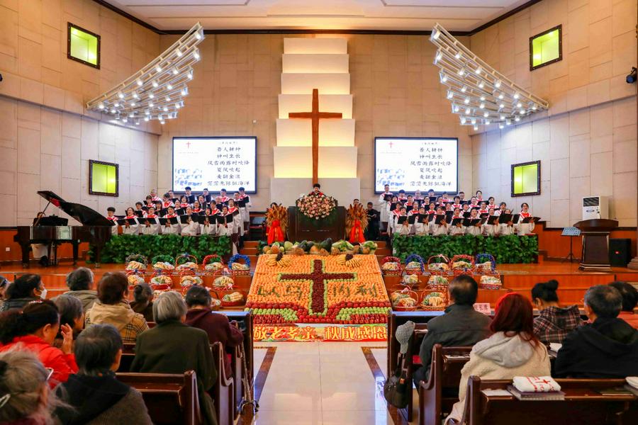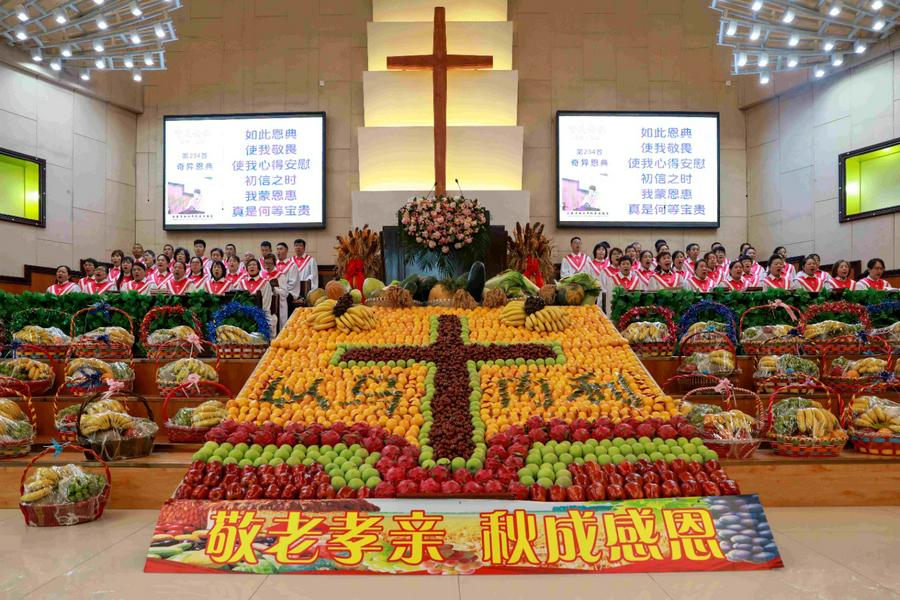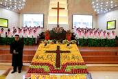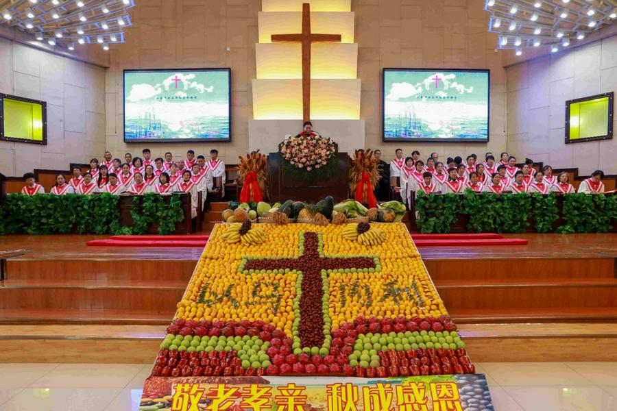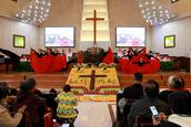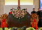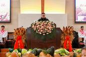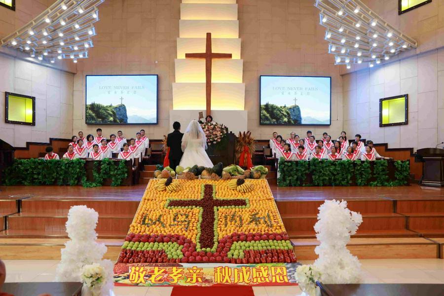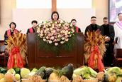 活动尚未正式开始,圣殿一至三层的礼拜堂已座无虚席。两千余位信徒齐聚一堂,在诗班与同工的带领下,以虔诚的读经与颂赞拉开了盛会的帷幕,圣殿前信徒精心摆放着象征丰收的玉米等硕果,组成了十字架和以马内利的字样。现场近八百位年过七旬的老年信徒尤为引人注目。教会同工们亲切躬身问候,为每位老人佩戴上象征基督之爱与健康长寿的鲜艳红花。那抹鲜红映衬着老人们布满笑意、写满岁月的皱纹。他们中有白发苍苍的老夫老妻相互搀扶,有的在家属陪伴下坐轮椅前来,均被恭敬地请至前排就座,那份从容与安详,恰如经上所记“如鹰展翅上腾,奔跑却不困倦,行走却不疲乏”,尽显信仰生命的荣光。