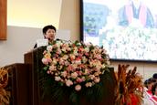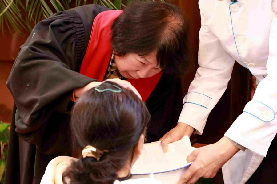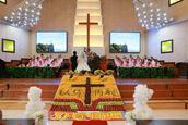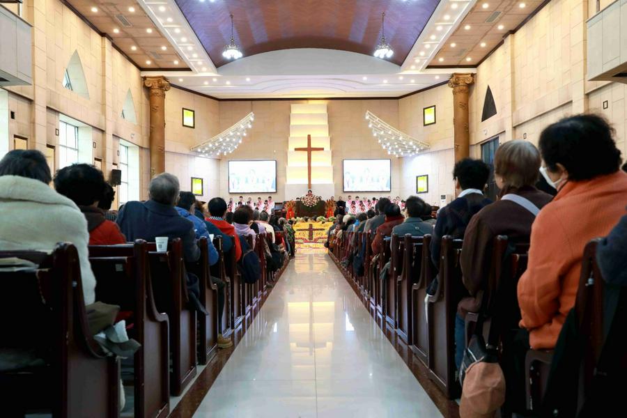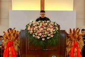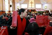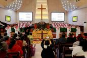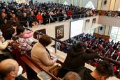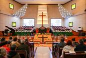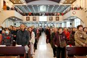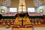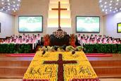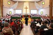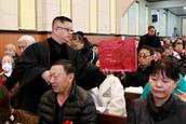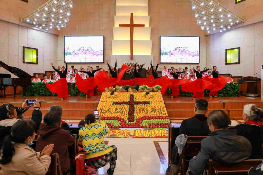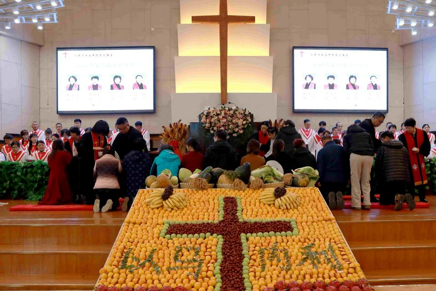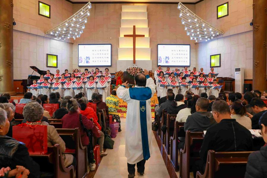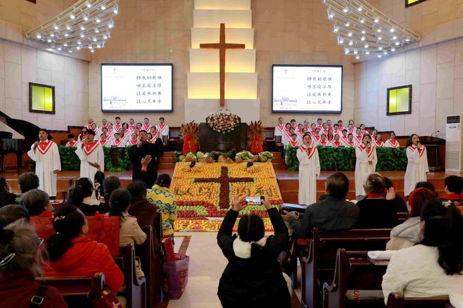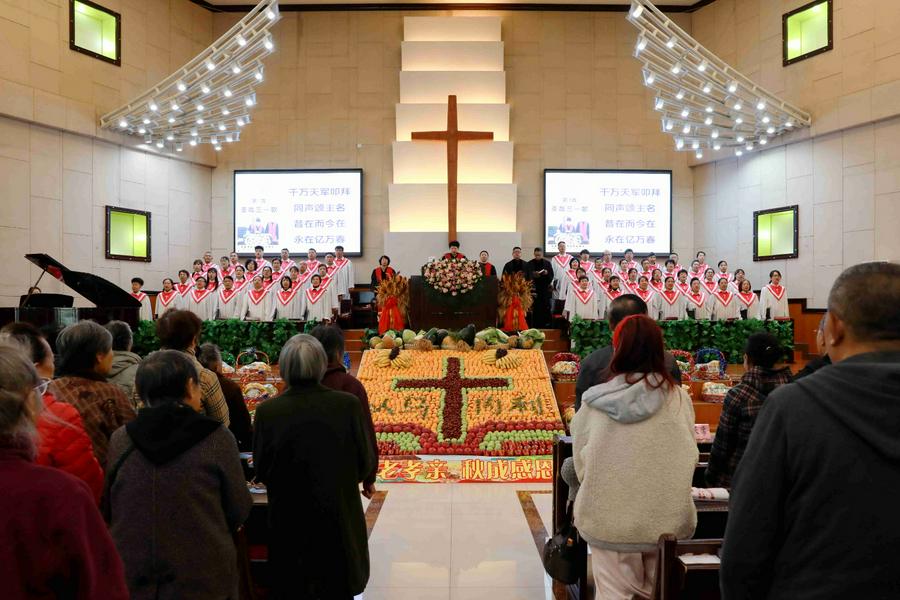 活动尚未正式开始,圣殿一至三层的礼拜堂已座无虚席。两千余位信徒齐聚一堂,在诗班与同工的带领下,以虔诚的读经与颂赞拉开了盛会的帷幕,圣殿前信徒精心摆放着象征丰收的玉米等硕果,组成了十字架和以马内利的字样。现场近八百位年过七旬的老年信徒尤为引人注目。教会同工们亲切躬身问候,为每位老人佩戴上象征基督之爱与健康长寿的鲜艳红花。那抹鲜红映衬着老人们布满笑意、写满岁月的皱纹。他们中有白发苍苍的老夫老妻相互搀扶,有的在家属陪伴下坐轮椅前来,均被恭敬地请至前排就座,那份从容与安详,恰如经上所记“如鹰展翅上腾,奔跑却不困倦,行走却不疲乏”,尽显信仰生命的荣光。